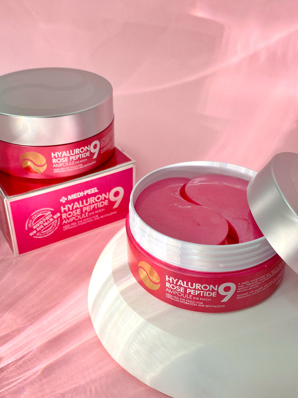 MEDI-PEEL Hyaluron Rose Peptide 9 Ampoule Eye Patch roosi ekstrakti ja peptiididega on premium-hooldus intensiivseks niisutamiseks, nahka elustamiseks ja noorendamiseks silmaümbruses. Koheselt vähendab turseid, värskendab väsinud silmi, helendab õrnalt tumedaid silmaaluseid ja toniseerib õrna nahka.