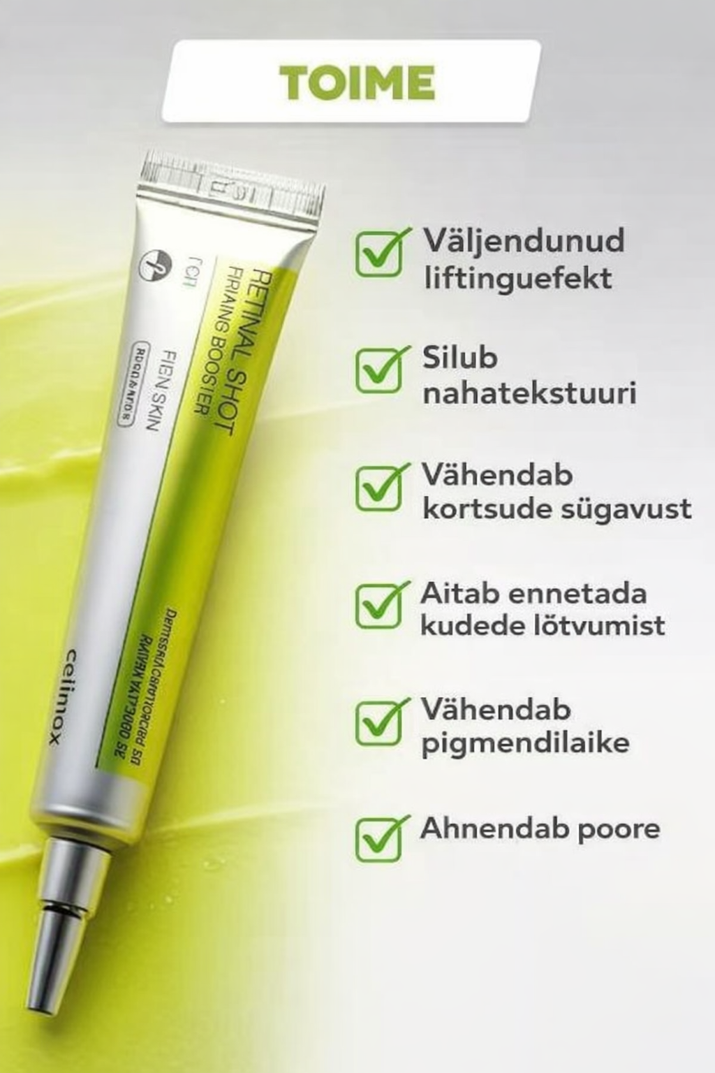 Celimax The Vita-A Retinal Shot Tightening Booster on innovatiivne uue põlvkonna öine booster, mis aitab vähendada kortse, parandada naha elastsust ja ühtlustada nahatooni. 0,03% retinal (retinaldehüüd) toimib kiiremini kui klassikaline retinool, olles samal ajal õrn ja sobiv ka tundlikule nahale. A-SHOT™ Retinal Capsules tehnoloogia sisaldab üle 228 000 mikrokapsli, mis viivad toimeained sügavamatesse nahakihtidesse ja vähendavad ärrituse riski. 10 peptiidi, keramiidide, pantenooli, niatsiinamiidi ja E-vitamiini kompleks tugevdab naha kaitsebarjääri ja parandab naha elastsust. Booster aitab siluda kortse, parandada naha tekstuuri ja taastada terve sära. Sobib kõikidele nahatüüpidele ning on ideaalne õhtuseks nahahoolduseks. Eelised: •0,03% retinal vananemisvastaseks hoolduseks •A-SHOT™ mikrokapslid täpseks toimeaine kohaletoimetamiseks •10 peptiidi ja keramiidid tugevdavad nahka •pantenool, niatsiinamiid ja E-vitamiin rahustavad •vähendab kortse ja parandab tekstuuri •suurendab elastsust •sobib tundlikule nahale •kerge ja kiiresti imenduv tekstuur Kasutamine: •kanda õhtul puhastatud kuivale nahale •kasutada 1–2 vajutust, vältida silma- ja huulepiirkonda •alustada 2 korda nädalas ja suurendada järk-järgult •hommikul kasutada SPF 30+ •vajadusel kasutada koos niisutava kreemiga Maht: 15 ml Päritoluriik: Korea 🇰🇷